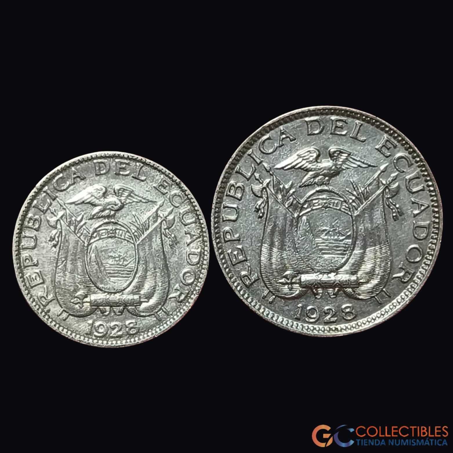 Anv.: Escudo nacional del Ecuador con leyenda “REPÚBLICA DEL ECUADOR” y fecha 1928.