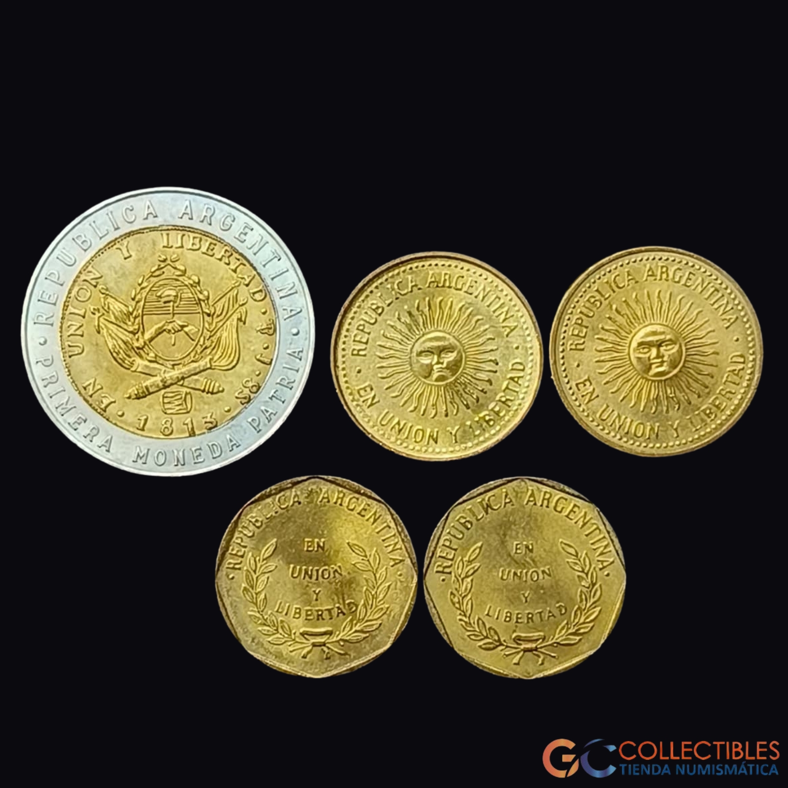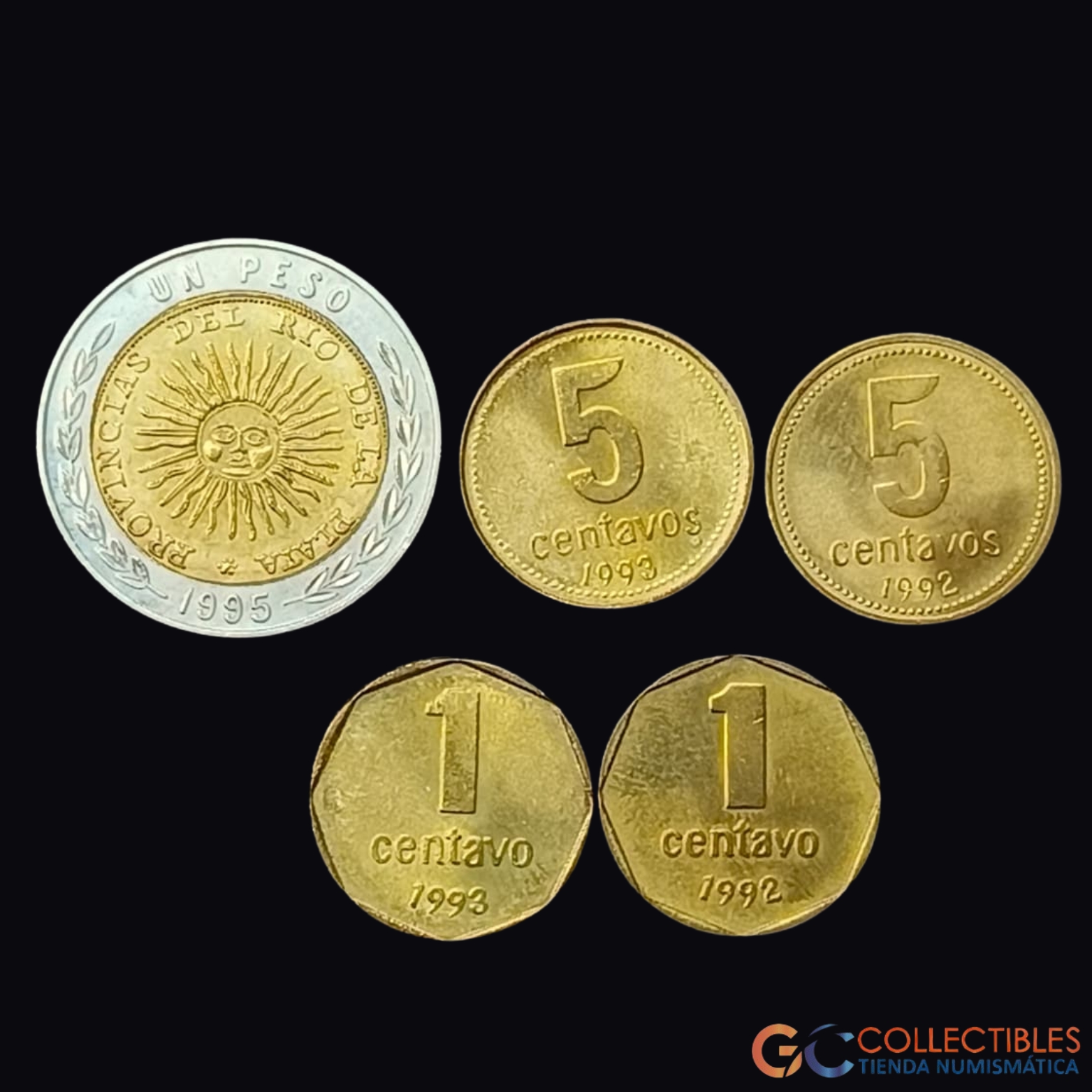 (1 y 5 Centavos 1992 ceca Canadá, 1 y 5 Centavos 1993 ceca México, 1 Peso 1995 ceca Francia)